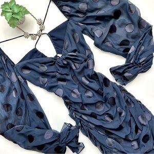 For Love And Lemons Lula Mini Dress Ruched Ruffle Navy Blue Dot Long Puff Sleeve