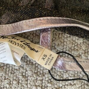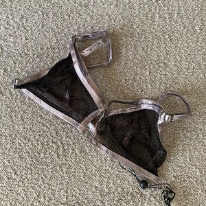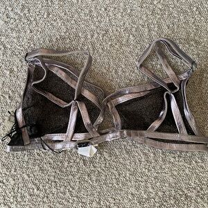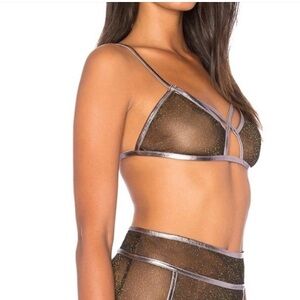 Sleek metallic black bralette with strappy design. Adds a modern touch to your lingerie.