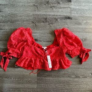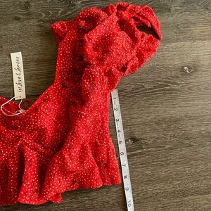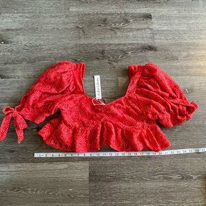 Vibrant red blouse with puff sleeves and tie details. Features playful polka dots and ruffled hem.