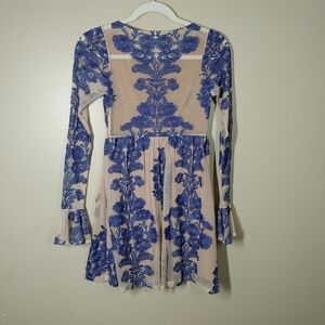 For Love And Lemons Temecula Mini Dress XS. nude mesh and blue floral embroidery. long sleeves with bell cuffs. baby doll. lined. zip side closure. measurements are approximate.