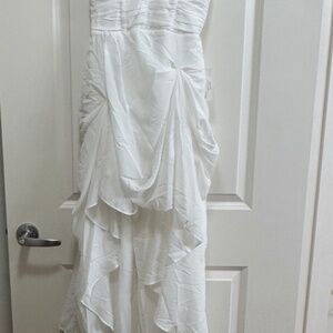Elegant white high low dress. Features delicate straps and ruffled details. Perfect for special occasions.