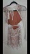 The dress features a white lace overlay with cutouts at the waist and a scoop neck with a tie at the back. The dress is fully lined and has long sleeves. The fabric is made of 100% nylon with a lining of 90% polyester and 10% spandex.