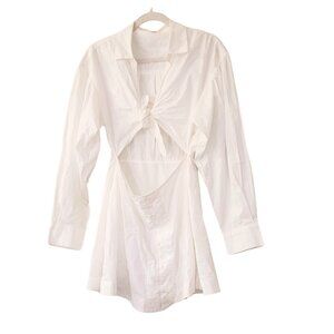 Chic white mini dress. Features a front knot detail. Long sleeves with a stylish cut.