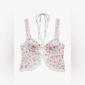 Charming floral bra set with delicate lace trim. Features vibrant pink and blue flowers. Perfect for a stylish and cozy fit.