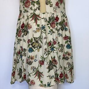 THIS IS SUCH A DARLING DRESS BY FOR LOVE & LEMONS. IT IS DONE IN VISCOSE WITH A NYLON CONTRAST. THE ADORABLE FOR LOVE AN LEMONS IS DONE IN A SOFT BEIGE SHADE WITH BLUE AND RED BLOSSOMS WITH GREEN LEAVES ADORNING IT. THE SCOOP NECK FEATURES BEIGE NETTING TO THE WAIST AND NETTING THROUGHOUT THE BACK TO THE WAIST. IT FALLS TO A FIT AND FLARE STYLE.SZ XS~EXCELLENT CONDITION, PLEASE NOTE THE MEASUREMENTS