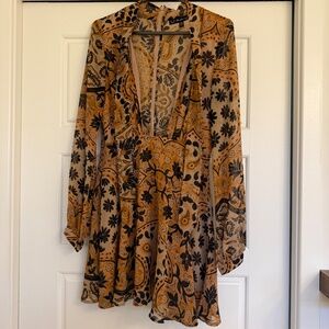 For Love & Lemon Brown Paisley Print Long Sleeve Elodi Tie Neck Mini Dress