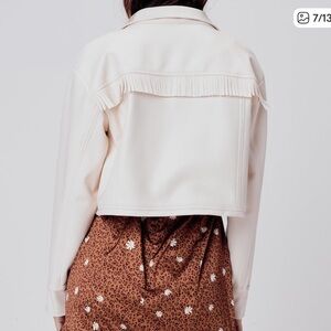 Western-inspired vegan leather cropped jacket featuring fringe detailing and metal snaps throughout. Functional front pockets, box-cut silhouette.