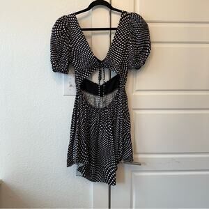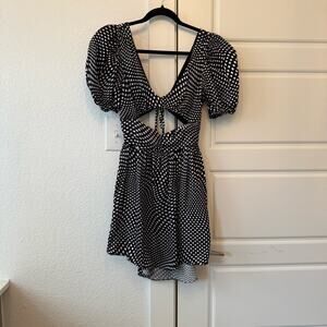 Stylish black and white polka dot dress with puff sleeves and cut-out detail. Perfect for a trendy look.