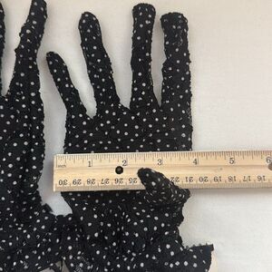 Black and white polka dot lace For Love & Lemons gloves with a bow embellishment. Designer size X Small. Fabric has stretch.