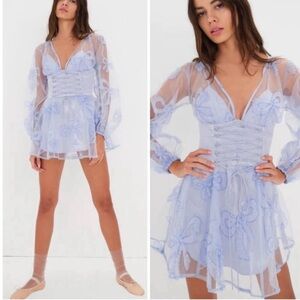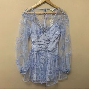 Keywords: tulle dress, mini dress, long sleeve dress, FL&L Presley Dress, feminine, girly, coquette girl, girlhoodcore, sequins, bows, mesh, blue, purple, lavender, periwinkle, party, pastel, spring, sheer, whimsical, playful, princess, flirty, NWT, new with tags, new with tag, fairy, fairycore, enchanting, ethereal, romantic