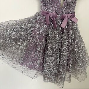 Features: Tulle fabrication with lining underneath, sequin embellishments, exaggerated skirt with ruffle detail, bow-ties underneath bust, sweetheart-neckline with supportive boning, off-the-shoulder sleeves, hook-and-eye closure at back with a cutout and hidden zipper