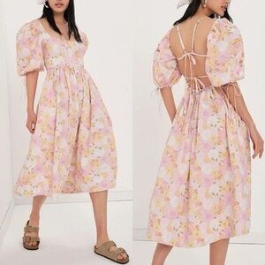 Style: Carrie Floral Corset Cutout Tie Back Ballon Sleeves Fit & Flare Midi Dress
