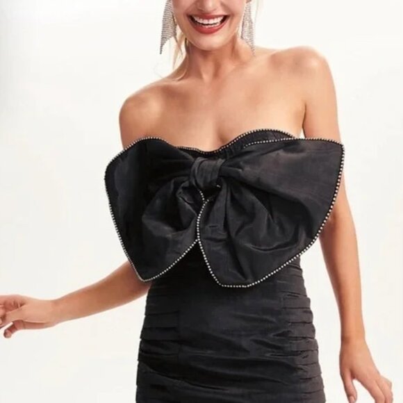 For Love & Lemon's Celeste Moire Rhinestone Trim Bow Mini Dress in black moire taffeta
