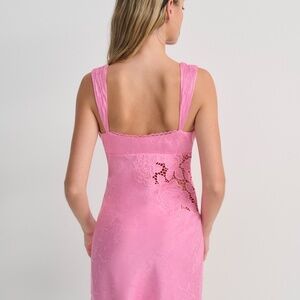 Inspired by the eternally chic style of Italian muses, the Claudia pink mini dress has timeless appeal. Cut to an asymmetrical silhouette with appliquéd embroidery and jacquard cut-away detailing, this pink dress is finished with additional romantic details like lace trims and a fixed satin rosette at the center-front neckline.