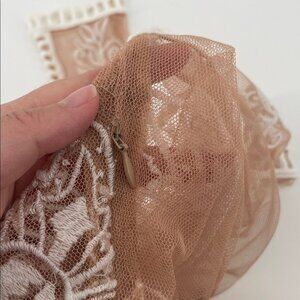 Stunning For Love & Lemons Desert Nights Mini Dress, featuring sheer nude mesh with intricate white floral embroidery. Elegant and romantic, this dress is perfect for parties, photoshoots, or layering over a slip for a chic evening look.