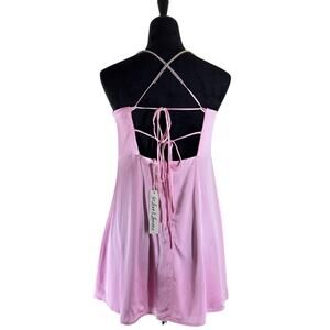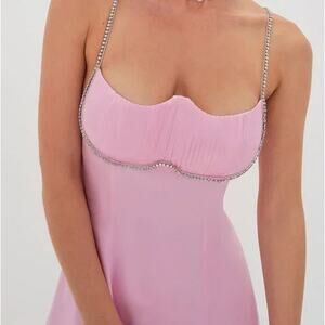 Perfect for parties or date nights, this For Love & Lemons Elora mini dress shimmers in pink satin with rhinestone crystal embellishment. Fully lined with underwire support and pleated bust detail.