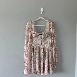 For Love & Lemons Emmaline Mini Dress. Brand New Never worn. Tags still attached. Crafted in sultry chiffon, this light yellow dress is decorated in a dream-like floral print. Constructed with pintucked underwire cups, the Emmaline long sleeve mini dress features romantic puff sleeves, plus all the feminine details including lace, velvet bows, and pearls.