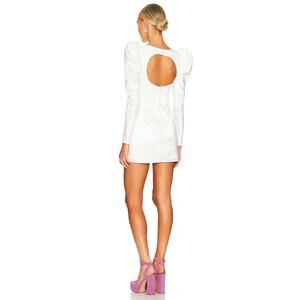 This dress is fully lined with a hidden back zipper closure and features exaggerated puff sleeves with ruched seam detailing, a back cut-out accent, and faux button loop details for a refined finish, crafted from 65% polyester, 20% nylon, 15% spandex with a lining of 98% recycled polyester and 2% spandex.