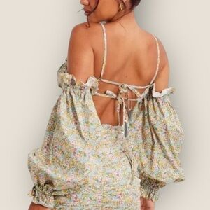 • Top Details: Bra-style bust with elastic ruffle trim, off-shoulder puff sleeves, adjustable tie-back