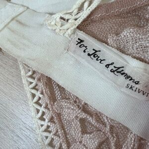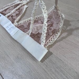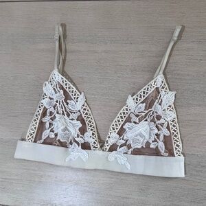 For Love & Lemons skivvies floral, lace bralette. White lace with cream mesh and white crocheted borders. Unlined triangle cups with no underwire. Adjustable 3-row hook and adjustable shoulder straps. The band is very stretchy. Very beautiful and feminine. Size S. Originally $90. Discoloration on straps and band.