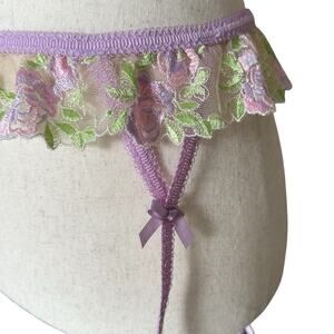 Romantic and feminine, this For Love & Lemons garter belt features delicate embroidered pink floral lace with soft lilac trim and green leaf detailing. Adjustable straps and satin bow accents add a flirty finish. Perfect for bridal, lingerie sets, or a special occasion.