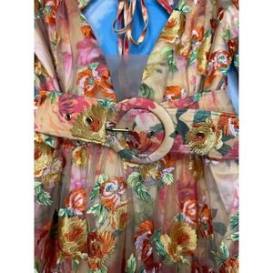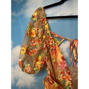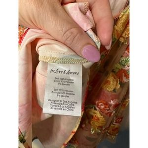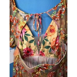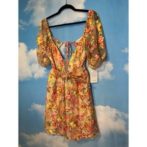 For Love & Lemons Floral Mini Dress Large Golden Yellow Plunge Short Sleeve Nwt
