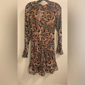 Beautiful long sleeved mini dress with ruffle details on cuffs, neckline and hem. V-neckline, fitted style with short flared hem, zipper on the back, lined.