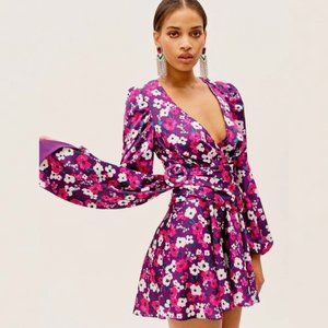 Vibrant plum floral print mini dress featuring a cross front bodice, figure-flattering ruched waist, and pretty peekaboo back. Cascading skirt sash, dramatic bell sleeves. Decorative circle belt buckle, made of recycled poly.