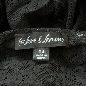 For Love & Lemons Harlow Lace Mini Dress in Black. Size XS. Features sweetheart neckline, three-quarter length puff sleeves, delicate rose rosette, underwire cups, and invisible zipper on the side. Unlined. Can be worn on its own or as a layering piece. Fabric: 64.9% nylon, 35.1% elastane. Great pre-owned condition. No flaws.