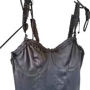 Mini dress with under-wire in cups. Ruffle trim at neckline and on straps. Adjustable straps with bow closure. Invisible zipper on back.