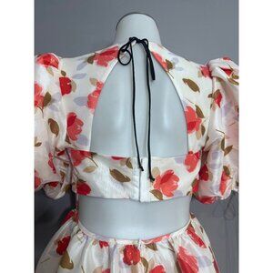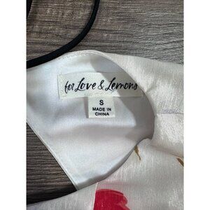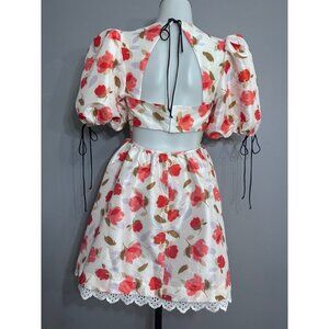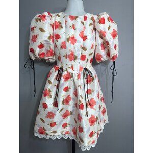 For Love & Lemons White And Red Floral Puff Sleeve Mini Dress. Round neckline. Back closure; top tie-up and middle hook. Tie-up detail on waist and sleeves. Lined. Tonal stitching.