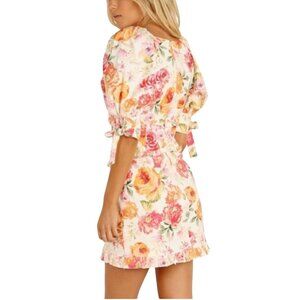 Elevate your wardrobe with this stunning For Love & Lemons Julep Mini Dress. Featuring a deep V-neck, floral design, and tie puff short sleeves, this fully lined linen blend dress is perfect for any occasion. Retail $240