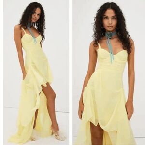 For Love & Lemons June Ruched Draped Tiered High Low Yellow Maxi Dress Small $378