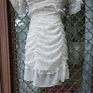 For Love & Lemons mini dress, ruched white party dress, floral ruffle cocktail dress, open back strappy dress, romantic date night dress, bodycon puff sleeve mini dress, coquette aesthetic outfit, Jaime King collab dress, ruched dress, floral mini, open back, puff sleeves, party dress, cocktail wear, coquette style, romantic dress, strappy back, ruffle hem