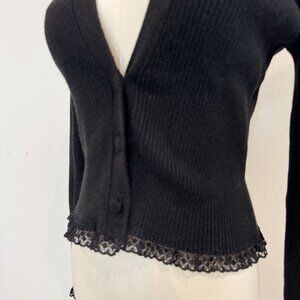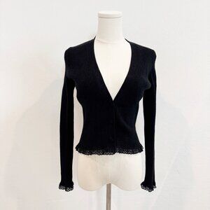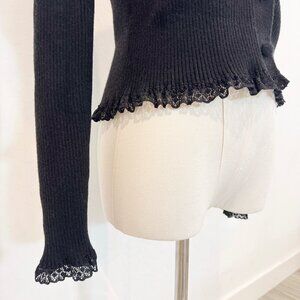 For Love & Lemons Lace Trim Ribbed Knit Fitted Cardigan Sweater Top Black Large