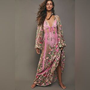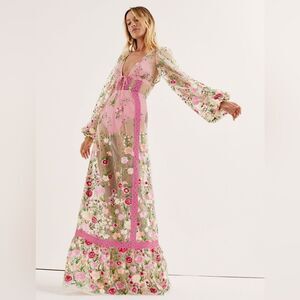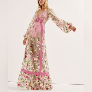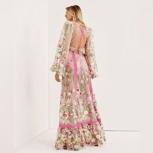 So special in a embroidered sheer fabrication, this floral maxi dress features a deep V-neckline, exaggerated sleeves, and minimal lining for added dimension.