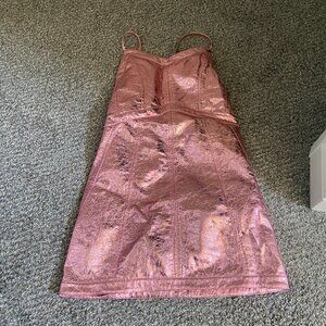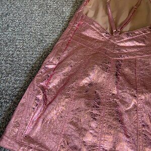For Love & Lemons ‘Luna’ dress. Retro, 90s inspired designed mini. Pink metallic faux leather. Low cut arm openings. Pointed, low back with adjustable shoulder straps. Lined. Side zip. Cotton/polyurethane/spandex.