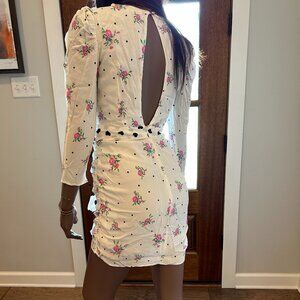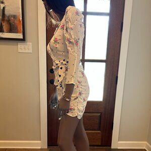 Like a fresh spring bouquet, the Mabel Mini Dress blossoms with the season. Designed with a floral and polka dot print, this feminine mini dress features a chic overlap detail with a v-neckline and a draped sleeve that is finished with a contrast heart print waist belt. This one would be great to wear to a wedding reception, date night, or even girls' night out.
