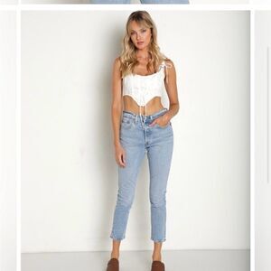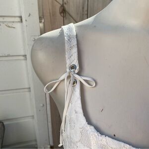 For Love & Lemons Maureen Top in White NWT Featured in white tulip lace, Maureen is a boned corset top with an exaggerated hemline, shoulder straps with grommets, skinny bow tie details at front and criss-cross skinny tie details at back. Hook and eye closure at center back. This corset top is fully lined. Fabric: Self: 52.8% Viscose, 47.2% Nylon; Lining: 98% Recycled Polyester, 2% Spandex Care: Dry clean only. No size tag but fits perfectly on my size 6 mannequin also please look at pictures for measurements