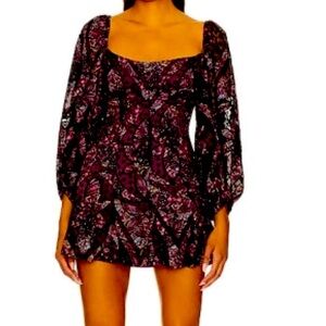 For Love & Lemons “Valerie” mini dress. NWT. Size small. Burgundy & black lace, embroidered dress. Beautiful detailing both front and back. Lined with a burgundy attached slip. Tie in back, puff sleeves. Perfect for day or a night on the town. Comes with matching belt or sash.