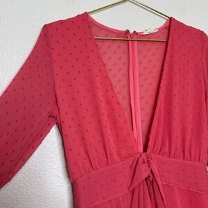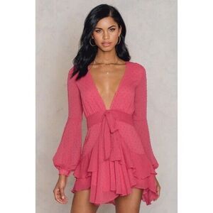 Pretty pinks to take you into Spring. The Tarta Dress features billow long sleeves in a lightweight flowy fabric. A Deep V and tied waist detail upon feminine ruffles lend itself to a flattering fit.. Silk blend. Hand wash cold. Partially lined. Button cuffed sleeves and waist tie. Textured dot fabric. Hidden back zipper closure.