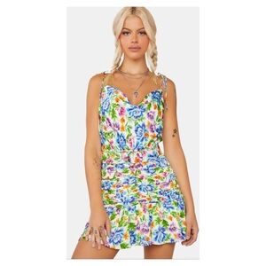 Matte satin fabric with ruched waist and ruffle hem. Floral print. Cowl neckline. Skinny-tie straps. Criss-cross tie straps details at back. Open back with keyhole at lower back. Gathered ruffle detail. Dress includes matching floral print belt. Fully lined.