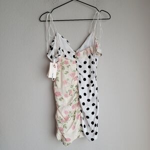 When you can't make up your mind, the Mochi mini dress gives you the best of both worlds. Featuring both a classic polka dot and a romantic floral print, this ruched mini dress is complete with cascading ruffles and spaghetti tie straps. Fully lined.