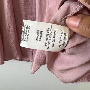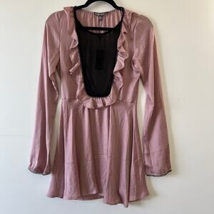 Great new with tags condition - there is a small pull at the seam stitching on the arm please see photos. Dress is pink with a black mesh panel over the chest. Flowy long sleeves.