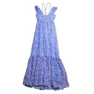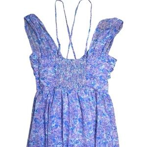 For Love & Lemons •Purple Floral Print •Criss Cross Adjustable Straps •Thick Shoulder Straps •Partially Smocked •Side Seam Zipper •Lined •wedding Guest •Bridal Shower •Party •Celebration •Cottagecore •Bridesmaid •Travel •Romantic