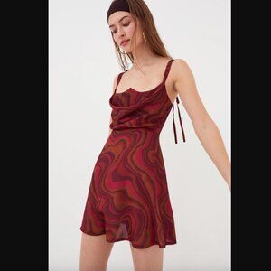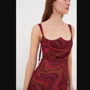 For Love & Lemons Red Eleanor Swirl Print Mini Dress S. Stone swirl chiffon mini dress with corset detail peeking out from cowl neck. Materials: Self: 100% Recycled Polyester; Lining: 98% Recycled Polyester, 2% Spandex. A few light snags in the chiffon. pit to pit 14.5", waist is 13", length 30"