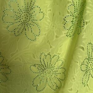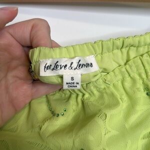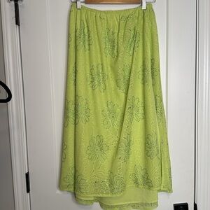 Stunning lime green midi skirt length by For Love & Lemons. Embellished with rhinestone daisies all over. High slit on front left side. Stretchy waist.
