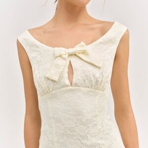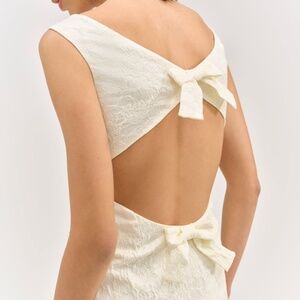 A playful nod to a timeless aesthetic, the Rosie Jacquard cream mini dress exudes vintage charm with its boat neckline and keyhole cut-out at the bust. This open back mini dress has a fitted bodice and is adorned with decorative bows throughout.