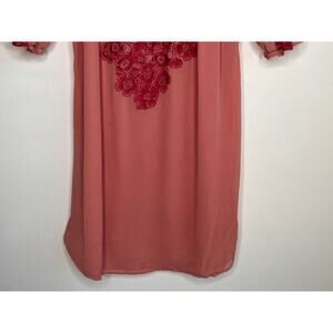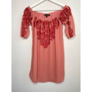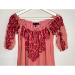Features: Sultry off the shoulder. Mini dress. Detailed floral embroidery. Elastic neckline. Lined. Poly. Dry clean. Flowy, boho, chic. Shift/swing dress. Color: Sangria. Dusty rose, pink. Elbow sleeve with elastic. Chiffon. Revolve.