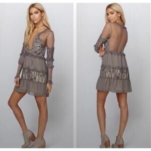 Stunning For Love & Lemons Alexa Mini Dress in Slate, size Medium! This delicate dress features romantic lace and sheer tulle, perfect for a special occasion or a night out. The grosgrain ribbons tie beautifully at the split neckline, adding a touch of elegance. With scalloped edges and long sleeves, this dress is both chic and comfortable.
